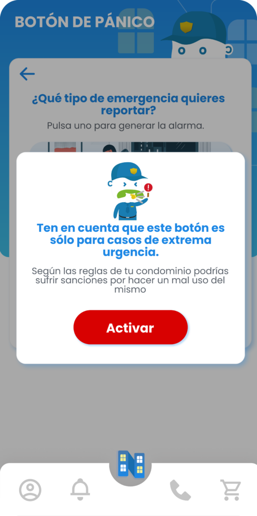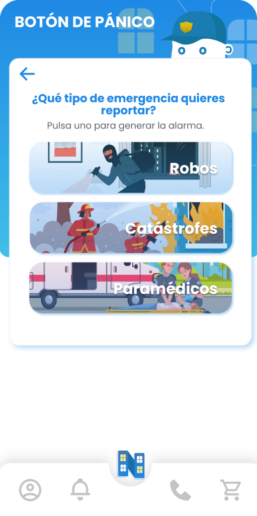 Brinda tranquilidad a tus residentes. Ante situaciones de emergencia, los usuarios pueden activar el botón de pánico, y se activarán alertas inmediatas para coordinar la asistencia necesaria.