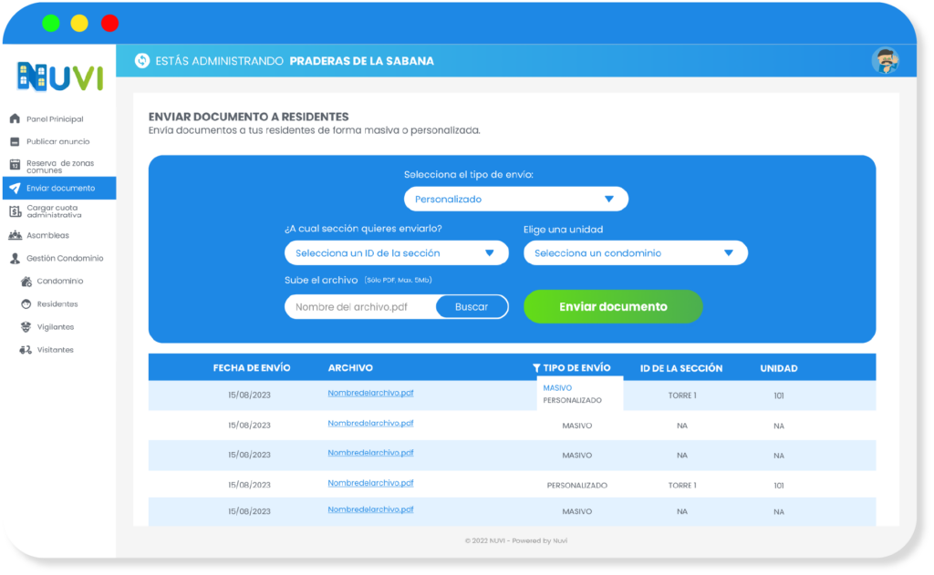 Con Nuvi, puedes enviar tanto documentos privados como públicos a los residentes. Los documentos se almacenan en una biblioteca virtual a la que los usuarios pueden acceder en cualquier momento.