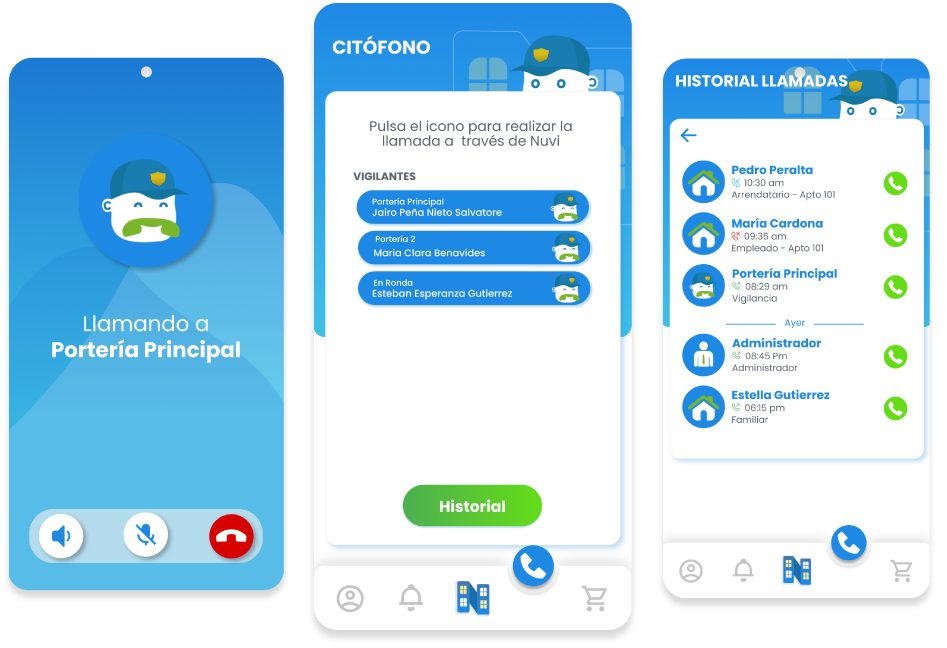 Gestiona las comunicaciones de forma sencilla y segura. Con Nuvi, los residentes pueden conectarse directamente con los vigilantes y estos con los administradores a través de la citofonía integrada en la app, sin necesidad de sistemas externos ni de compartir tu número personal.